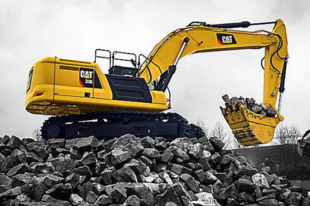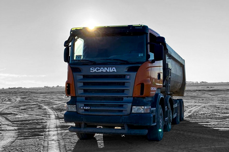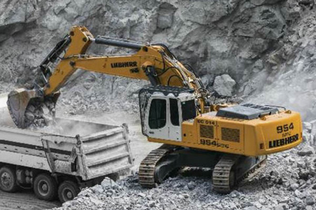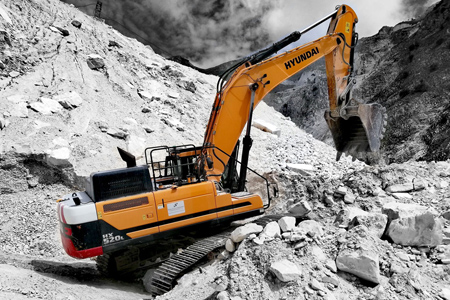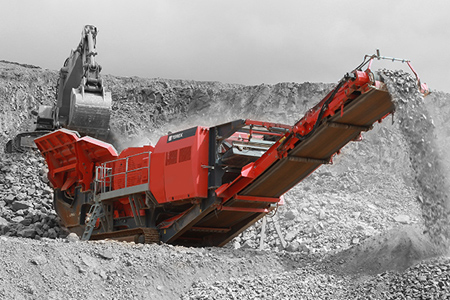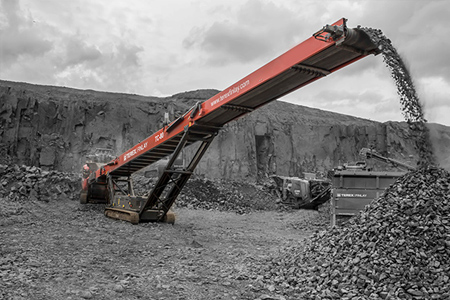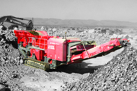 Una vez realizada la voladura, la piedra bruta es cargada por una excavadora y una cargadora frontal en camiones roqueros que la transportan y descargan en una mandibula Terex Finlay J-1480.
